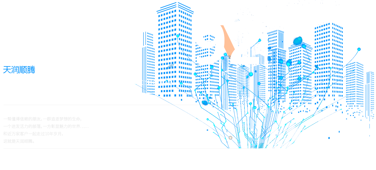 一幫值得信賴的朋友,一群追逐夢想的生命, 一個迸發活力的部落,一方彰顯魅力的世界…… 和近萬家客戶一起走過10年歲月, 這就是天潤順騰。